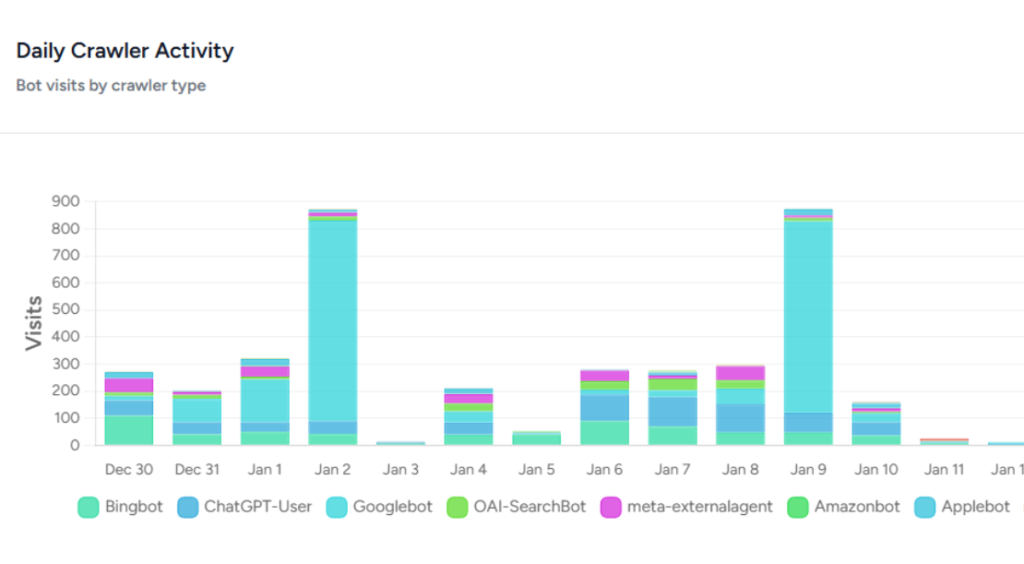 Track when AI models crawl your website, which pages are cited most often, and when your content is used for training in real time. Monitor crawler patterns, frequency and errors to improve your AI search performance.