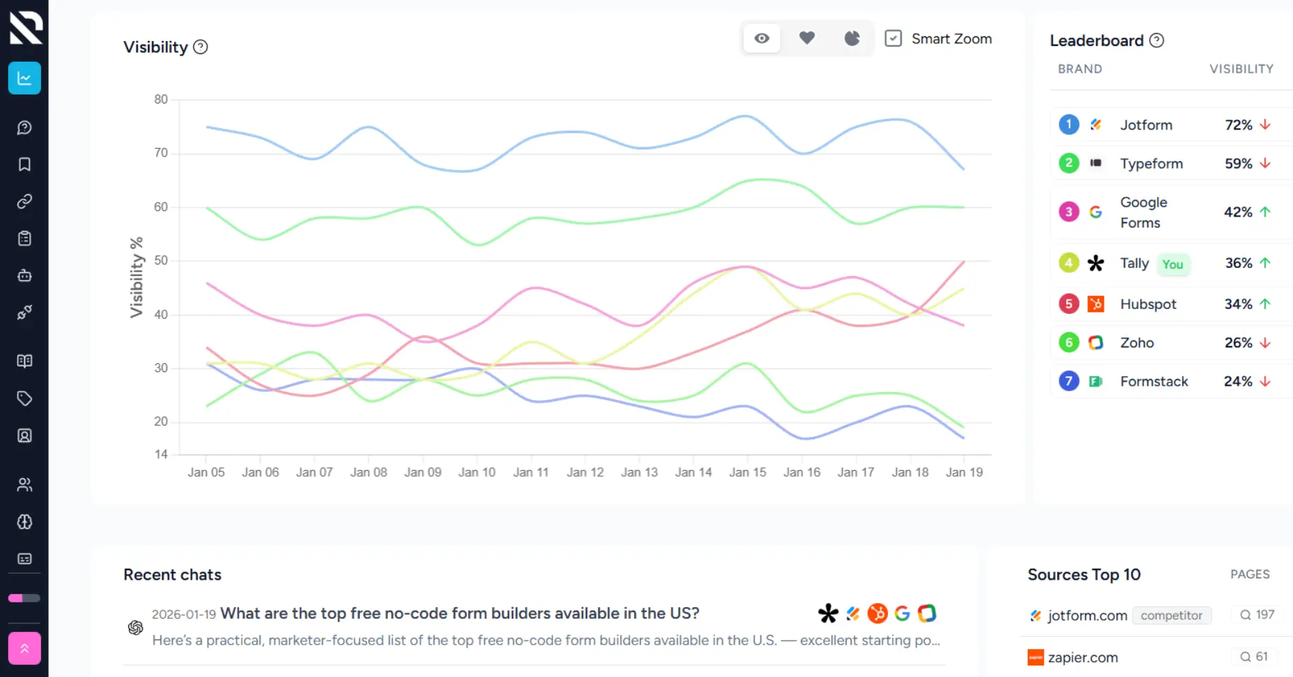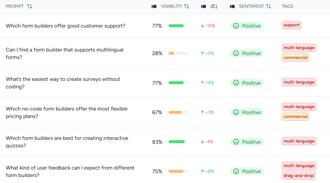 - Stay ahead of competitors by tracking and comparing their AI visibility performance.