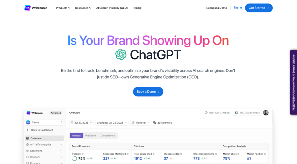 WritesonicAll-in-one SEO + GEO platform$199/mo (GEO from $249)