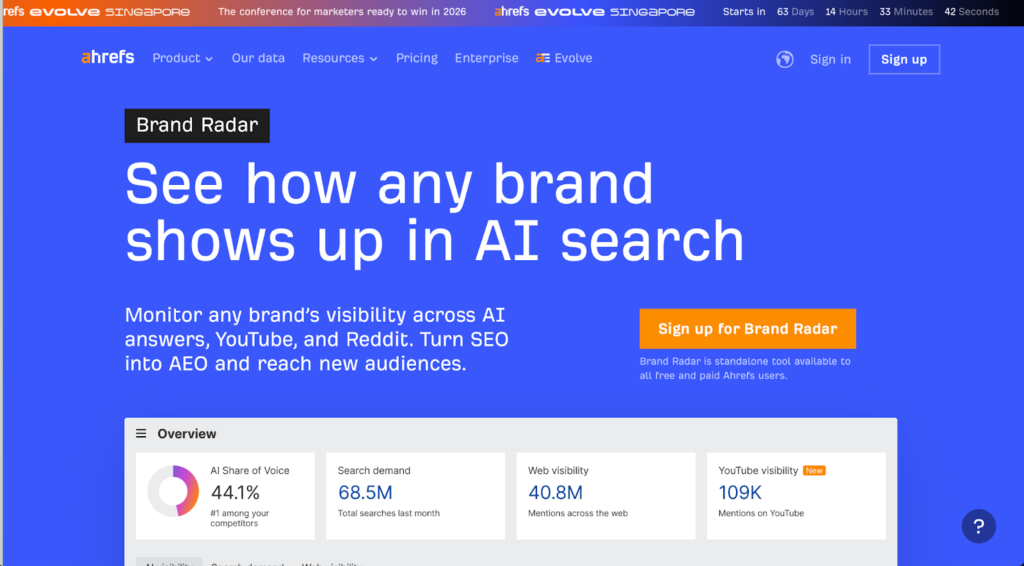 If you already live inside an existing SEO platform, Semrush’s AI Visibility Toolkit or Ahrefs Brand Radar let you add AI tracking without adopting a new tool, though both come with meaningful pricing add-ons and coverage limitations.