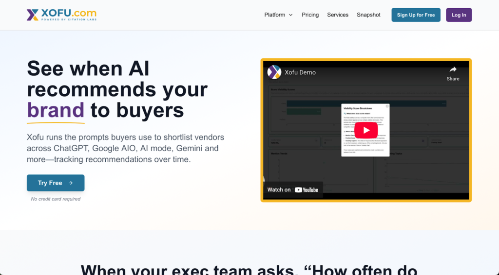Xofu is built by Citation Labs and focuses on a question most other tools don’t ask directly: when buyers use AI to shortlist vendors, does your brand show up?