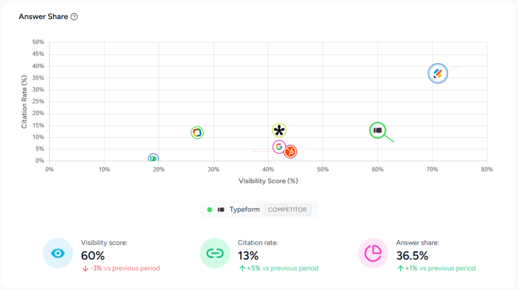 | Answer Share | Combined score based on visibility and citation rate, reflecting overall presence and authority in AI search | Shows how dominant your brand is in AI responses |