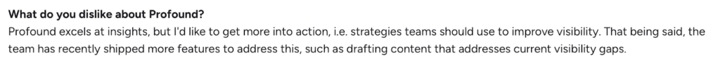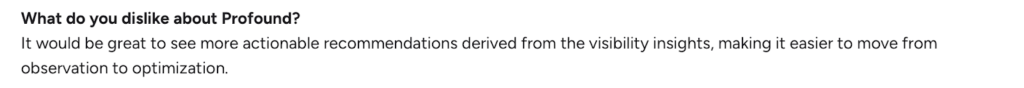 But it also comes with trade-offs. There’s a recurring theme in G2 user feedback: Profound shows a lot of data, but teams often need extra time to decide what to act on. Insights are there, but the path from insight to action isn’t always obvious.