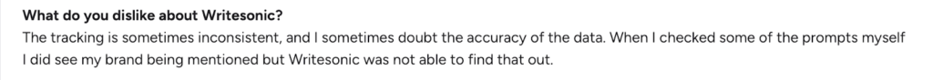 This feedback isn’t isolated. Some teams find that Writesonic’s tracking can miss mentions or lag behind real AI responses, which reinforces that its core strength is execution workflows, not deep LLM tracking accuracy.