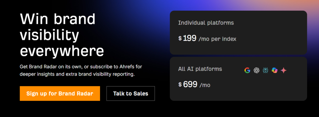 Ahrefs Brand Radar is priced on a per-index and per-site basis, which makes it expensive even at small scale. Individual AI platforms start at $199/month per index, and tracking all AI platforms costs $699/month for a single site.