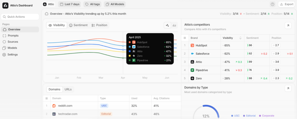 It tracks how models like ChatGPT, Perplexity, Gemini, and others surface your brand, which prompts trigger your content, and where competitors show up instead. From there, it suggests what to write or update to improve how AI engines reference you. That makes it very different from Otterly AI, which focuses more on monitoring than on execution.