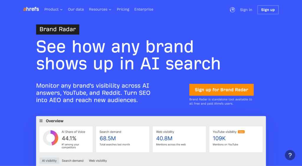 Ahrefs Brand RadarBrand mentions in AIFast brand monitoring inside AI and web~$129/mo