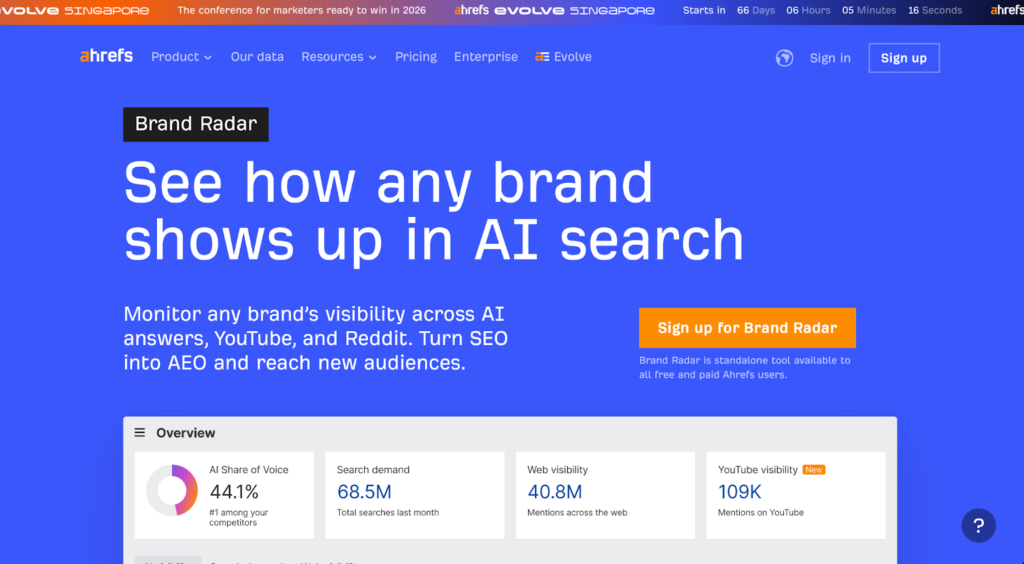 Ahrefs Brand Radar is Ahrefs’ entry into AI visibility tracking. It’s built on their massive proprietary dataset (192M+ prompts) and approaches AI visibility more like a research database than a traditional rank tracker.